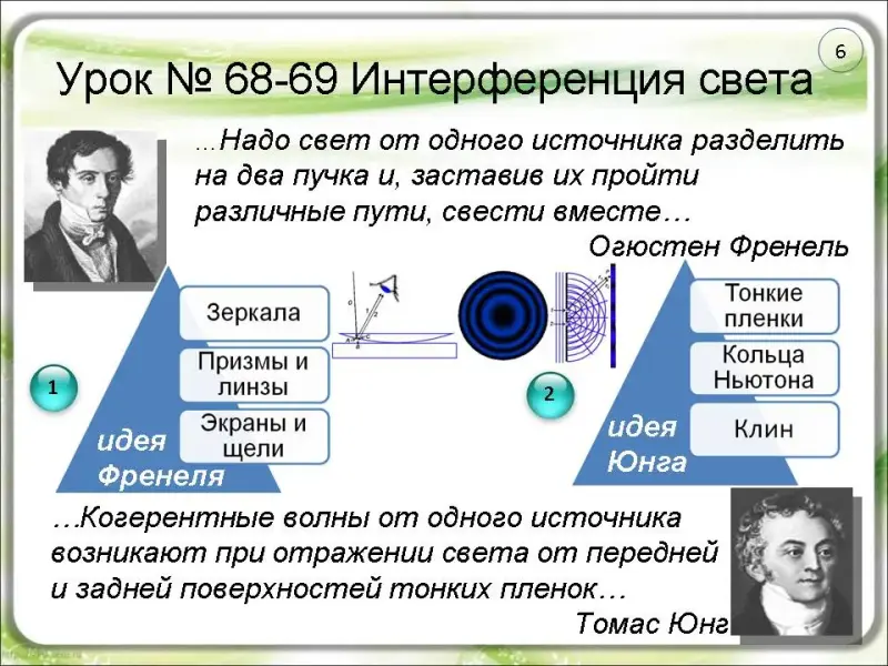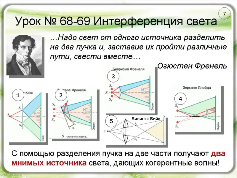 Для получения когерентных источников света французский физик Огюстен Френель нашел в 1815 г. простой и остроумный способ. Надо свет от одного источника разделить на два пучка и, заставив их