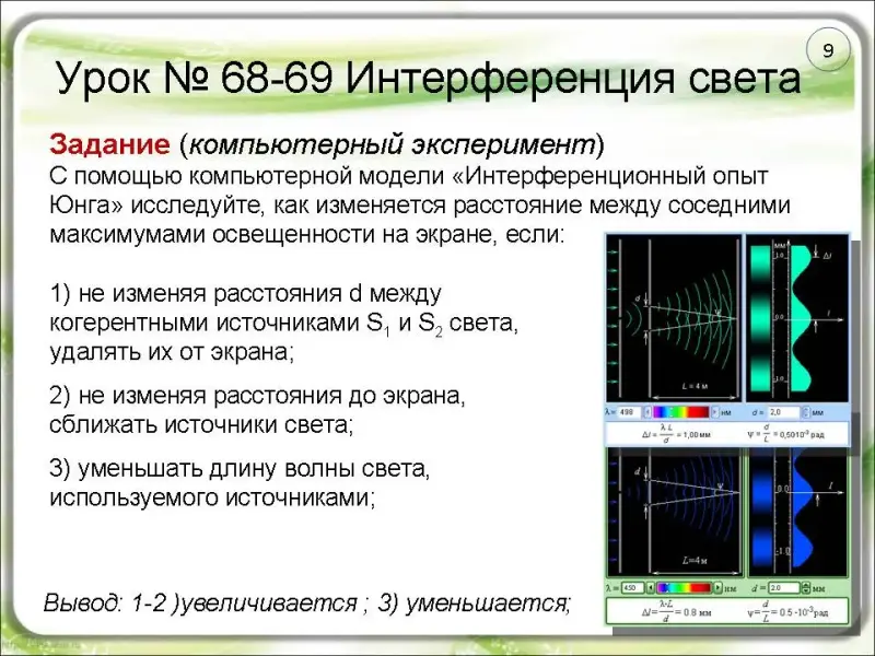Задание: с помощью компьютерной модели «Интерференционный опыт Юнга» исследуйте, как изменяется интерференционная картина от двух когерентных источников на экране, если: