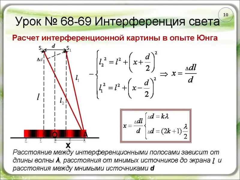 Учитель: Произведем расчет интерференционной картины в опыте Юнга. Интерференционная картина от двух мнимых источников позволяет достаточно точно определить длину световой волны