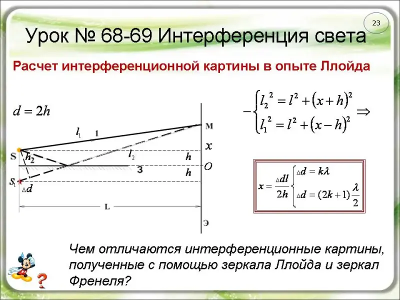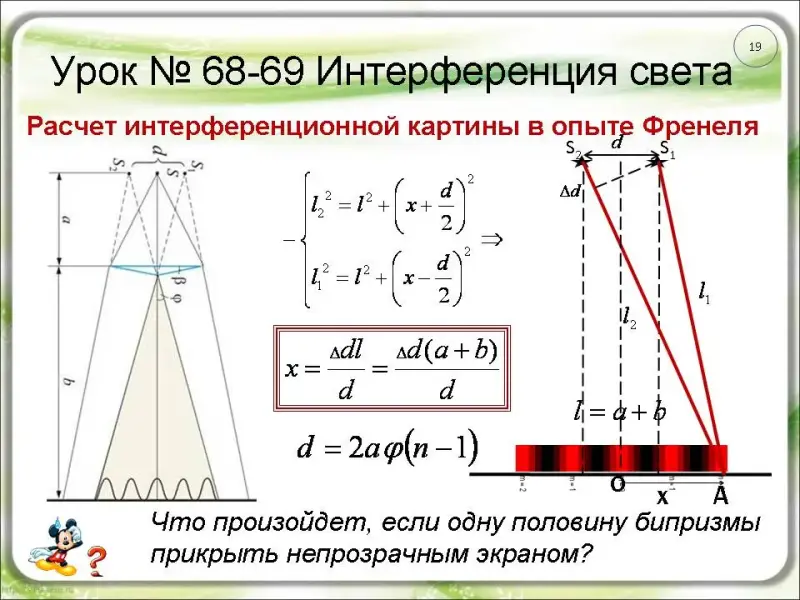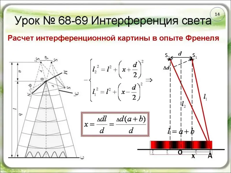 (слайды 14-15, 19). Вид интерференционной картины в опытах Френеля, как и в опыте Юнга, зависит от