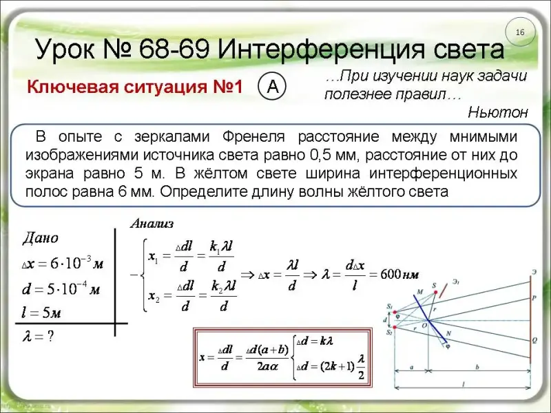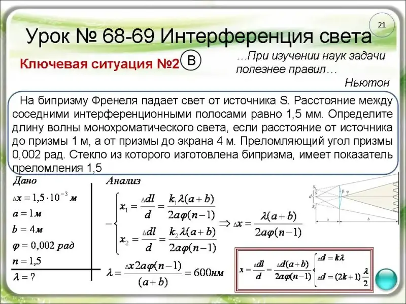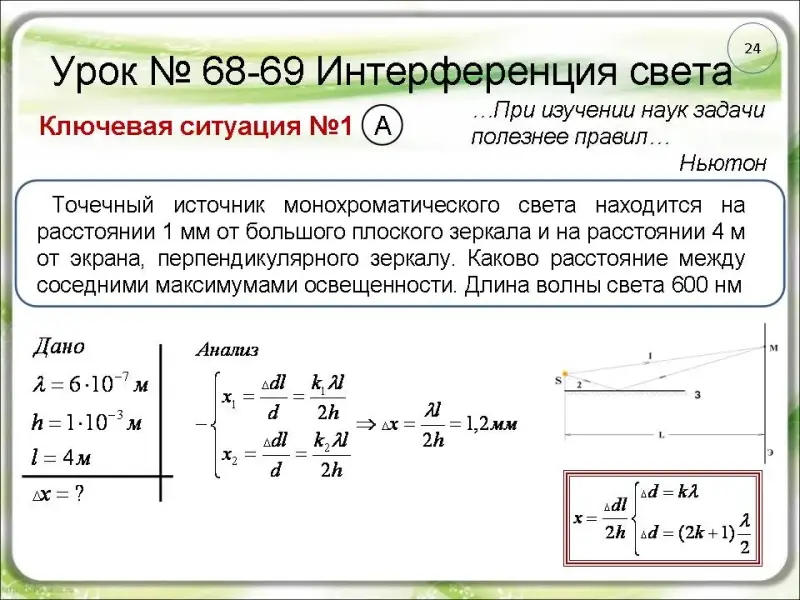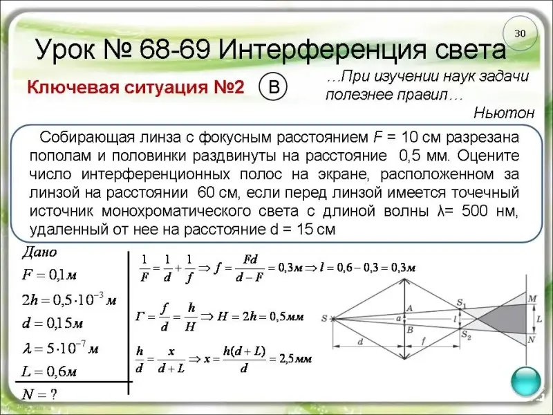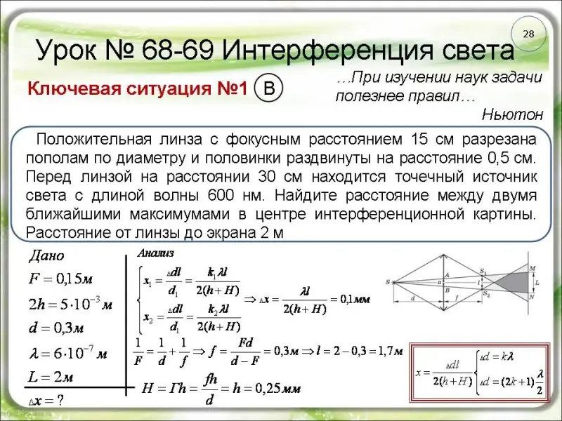 длиной волны 600 нм. Найдите расстояние между двумя ближайшими максимумами в центре интерференционной картины. Расстояние от линз до экрана 2 м (слайд 28).
