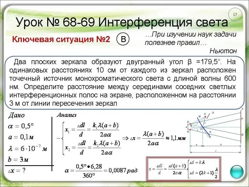 Определите расстояние между серединами соседних светлых интерференционных полос на экране, расположенном на расстоянии 3 м от линии пересечения зеркал. (Cлайд 17)