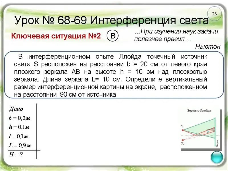 зеркала. Длина зеркала L= 10 см. Определите вертикальный размер интерференционной картины на экране, расположенном на расстоянии l = 90 cм от источника. (слайд 25)