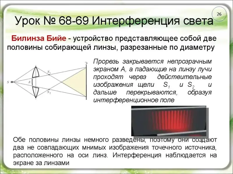 Опыт Бийе. Схема, известная под названием билинзы Бийе, осуществляется с помощью линзы, разрезанной по диаметру, обе половинки слегка разводятся, благодаря чему получаются два