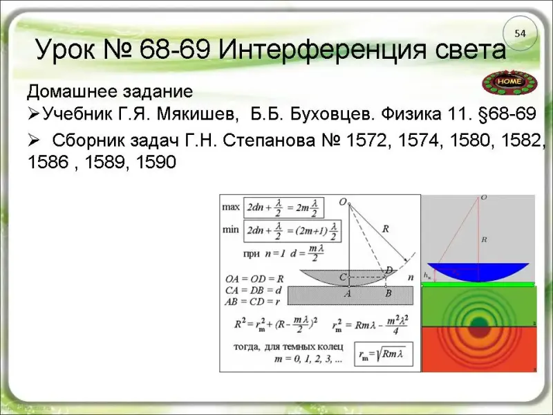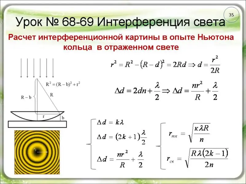Учитель: Выполним расчет интерференционной картины в опыте Ньютона кольца в отраженном и проходящем свете (слайды 35-36). Обратите внимание, что: