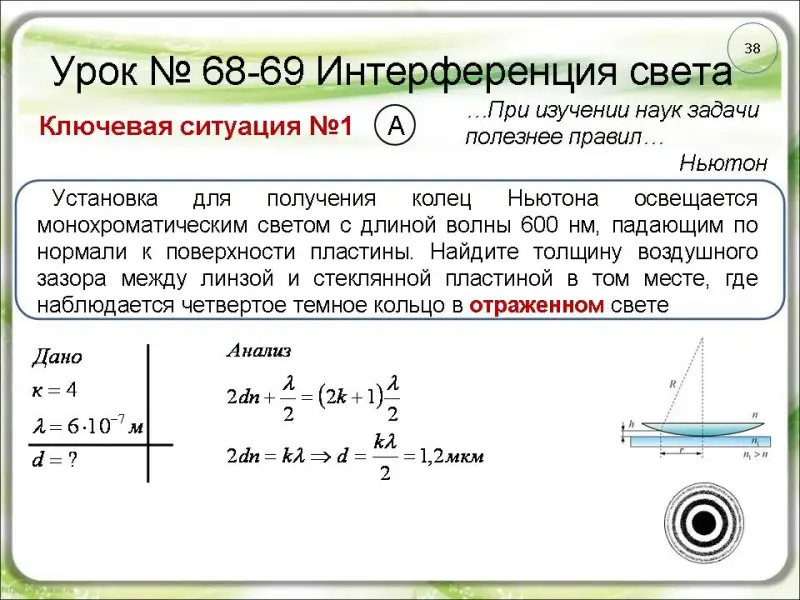стеклянной пластиной в том месте, где наблюдается четвертое темное кольцо в отраженном свете (слайд 38).