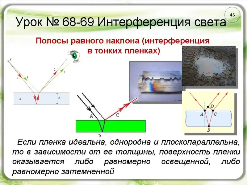 внутренней. Глаз сводит вместе когерентные волны на сетчатке глаза, если рассматривать поверхность пленки. Разнообразная окраска пленок объясняется тем, что их толщина не везде одинакова и в разных