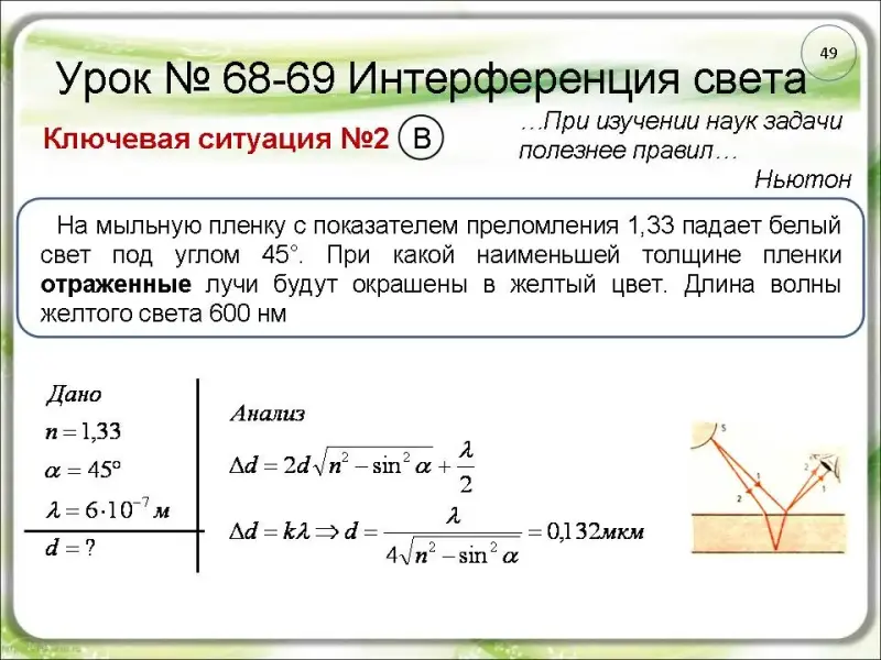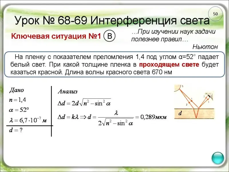 16. На пленку с показателем преломления 1,4 под углом α = 52° падает белый свет. При какой толщине пленка в проходящем свете будет казаться красной. Длина волны красного света 670 нм. (слайд 50).