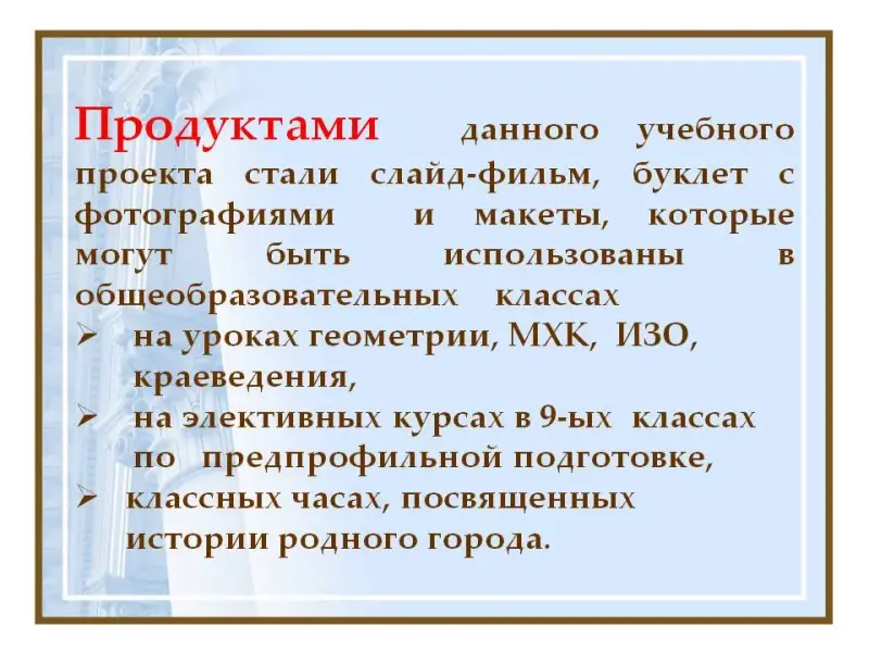 Учитель: Сегодня вы показали презентацию своей работы. (Слайд 45) Продуктами нашего проекта стали слайд-фильм, буклет с фотографиями и макеты, которые могут быть использованы на уроках геометрии, МХК, ИЗО, краеведения, на элективных курсах в 9-ых классах по предпрофильной подготовке, классных часах, посвященных истории родного города. У нас получился интересный разговор. Наши экскурсоводы смогли ответить на вопрос Николеньки Иртеньева. Конечно не всюду нас окружает симметрия. Но вернемся к вопросу, поставленному на голосование в начале урока: «Только ли симметрия является признаком красоты?» Проведем повторное голосование (голосование и обсуждение результатов). Класс делает вывод о том, что нужно согласиться с группой скептиков, которая утверждала, что в жизни есть место не только симметрии, но и ее частичному или полному отсутствию и от этого окружающий нас мир более гармоничен и красив.