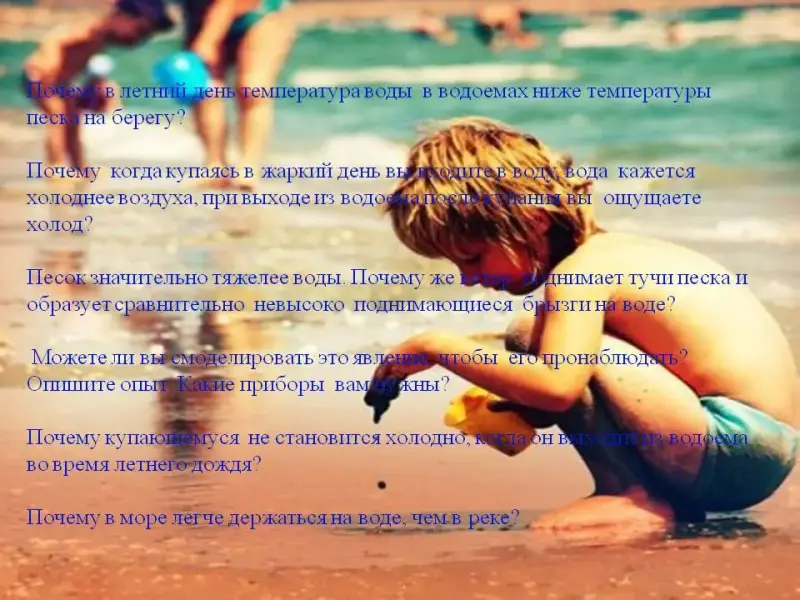 Почему в летний день температура воды в водоемах ниже температуры песка на берегу?