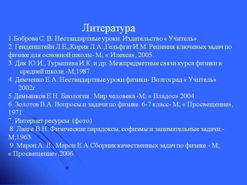 - Золотов В.А. Вопросы и задачи по физике. 6-7 класс- М; « Просвещение», 1971.
