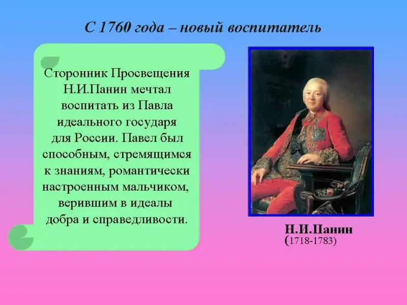 (слайд 6) С 1760 г. главным воспитателем Павла был назначен Н.И. Панин. Сторонник Просвещения Панин искренне привязался к великому князю и старался воспитать из него идеального монарха. Павел получил хорошее образование и, по свидетельствам современников, был способным, стремящимся к знаниям, романтически настроенным мальчиком с открытым характером, искренне верившим в идеалы добра и справедливости.
