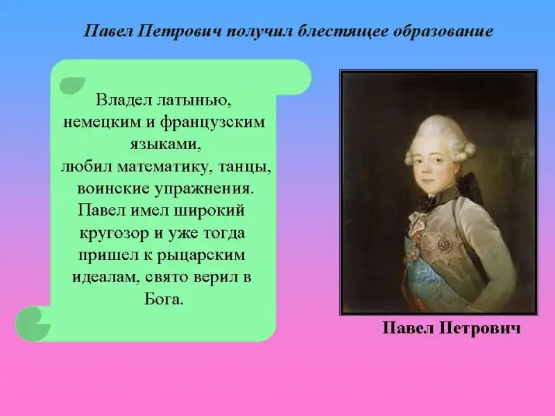 (слайд 7) Владел латынью, французским и немецким языками, любил математику, танцы, воинские упражнения. Таким образом, мы можем заметить, что в детские, отроческие и юношеские годы Павел получил блестящее образование, имел широкий кругозор и уже тогда пришёл к рыцарским идеалам, свято уверовал в Бога.