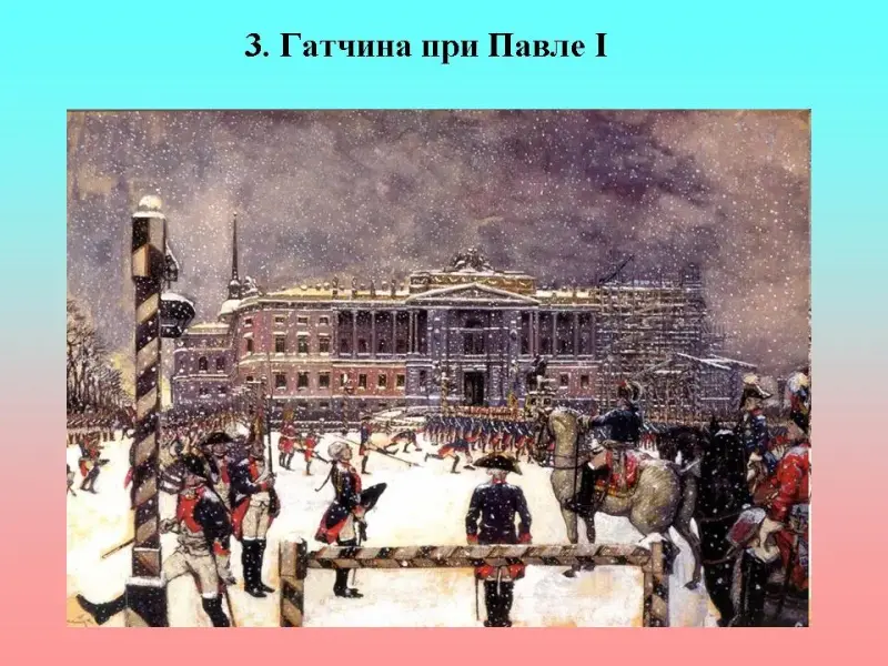 (слайд 14) Здесь Павел завёл обычаи, резко отличные от петербургских. С утра до вечера вахтпарады сменяли плац-парады, разводы караулов чередовались экзекуциями. Гатчинские строгие порядки в корне отличались от царившей в русском офицерстве барственности и вседозволенности, того, что сам Павел метко окрестил "потёмкинский дух".