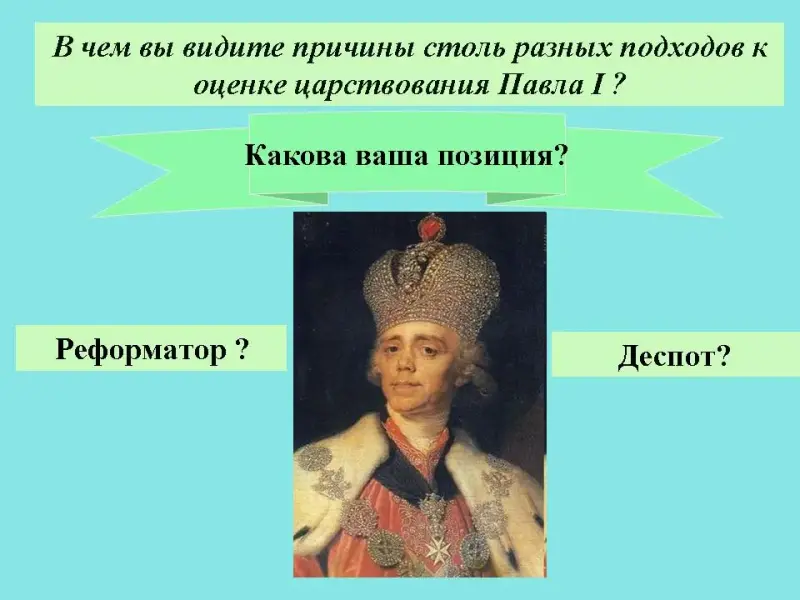 (слайд 48) Вопрос. В чем вы видите причины столь разных позиций к оценке царствования Павла I? Какова ваша позиция? Кем же был для страны Павел I - неудавшимся реформатором или деспотом?