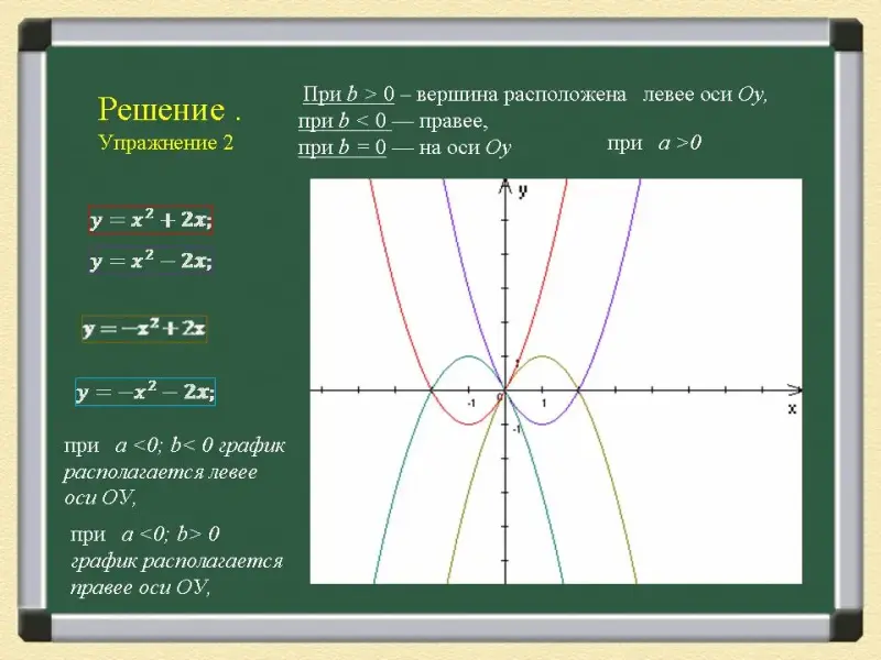 При b > 0 вершина расположена левее оси Оу, при b < 0 - правее, при b = 0 - на оси Оу.