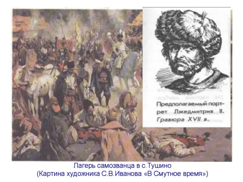 Ответ: Самозванец - Лжедмитрий II («Тушинский вор»), неизвестного происхождения. С 1607 выдавал себя за якобы спасшегося царя Дмитрия (Лжедмитрия I).