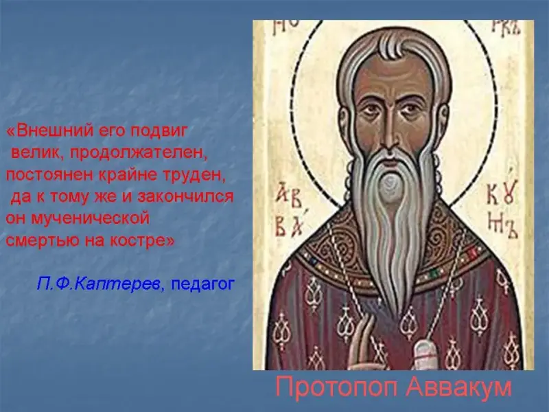 Ответ: Протопоп Аввакум Петрович, глава старообрядчества и идеолог раскола в православной церкви, писатель. Выступил против реформы Никона.