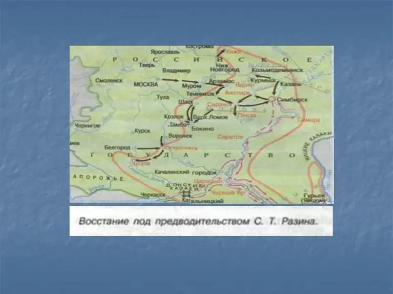 Ответ: Восстание под управлением Ст. Разина. Произошло в южных районах России на Волге и Дону в 1670-1671 гг.. Было вызвано усилением крепостного права и ограничением прав казачества со стороны властей. Происходило в два этапа: первый - «поход за зипунами» (через низовье Волги и Каспийское море в Персию за добычей), второй - поход на Москву. После неудачной осады Симбирска отряды восставших были разбиты. Потерпело поражение, С.Разин казнен.