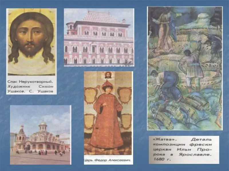 Ответ: 1. «узорочье», 2.парсуна, 3. бытовые сцены в росписи храма, 4. изображение живых человеческих черт в иконах.