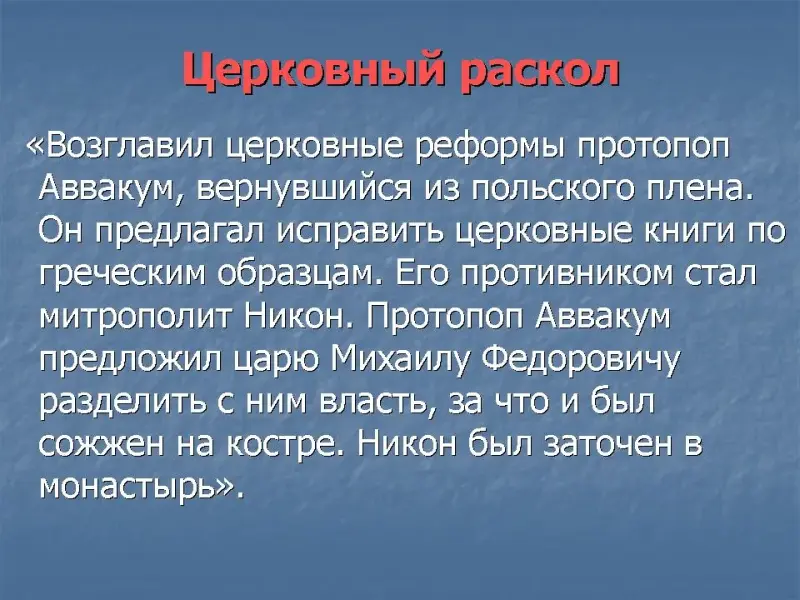 «Возглавил церковные реформы протопоп Аввакум, вернувшийся из польского плена. Он предлагал исправить церковные книги по греческим образцам. Его противником стал митрополит Никон. Протопоп Аввакум предложил царю Михаилу Федоровичу разделить с ним власть, за что и был сожжен на костре. Никон был заточен в монастырь».