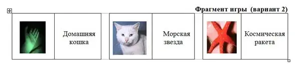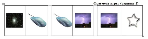 Вариант 1. Количество фишек - 28. Дидактический материал (для одного комплекта игрового материала) - три многозначных слова, имеющих по два ЛСВ, каждый из которых представлен на карточках в виде картинок. Например: звезда - 'небесное тело, ночью видимое как светящаяся точка', 'фигура, предмет, с треугольными выступами по окружности'; мышка - 'небольшой грызун с острой мордочкой, усиками и длинным хвостом', 'устройство управления компьютером'; молния - 'гигантская искра электрического разряда между тучами и землей', 'вид застежки на одежде, обуви, на сумках и пр.'. В качестве дидактического материала можно использовать и два многозначных слова, имеющих по три ЛСВ. Правила игры общепринятые. На пропедевтическом этапе обучения достаточно предложить детям подобрать и приложить соответствующие друг другу картинки, отражающие значения многозначных слов. На репродуктивном и продуктивном этапах обучения целесообразно предлагать учащимся называть значения слов и составлять контексты (словосочетания или предложения).