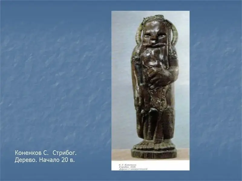 А вот другой пример: сказочный старичок «Стрибог». Эту скульптуру вырезал из дерева русский скульптор Коненков в начале 20 века. Это тоже изображение человека, только мысли и настроение оно рождает совсем другие. Что вы можете сказать о нем?