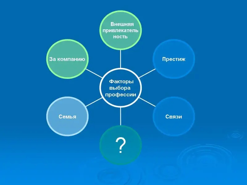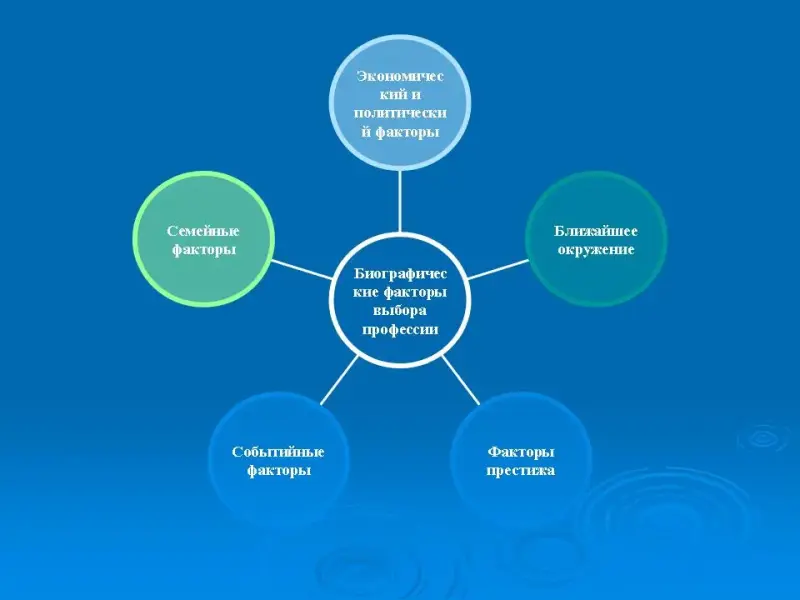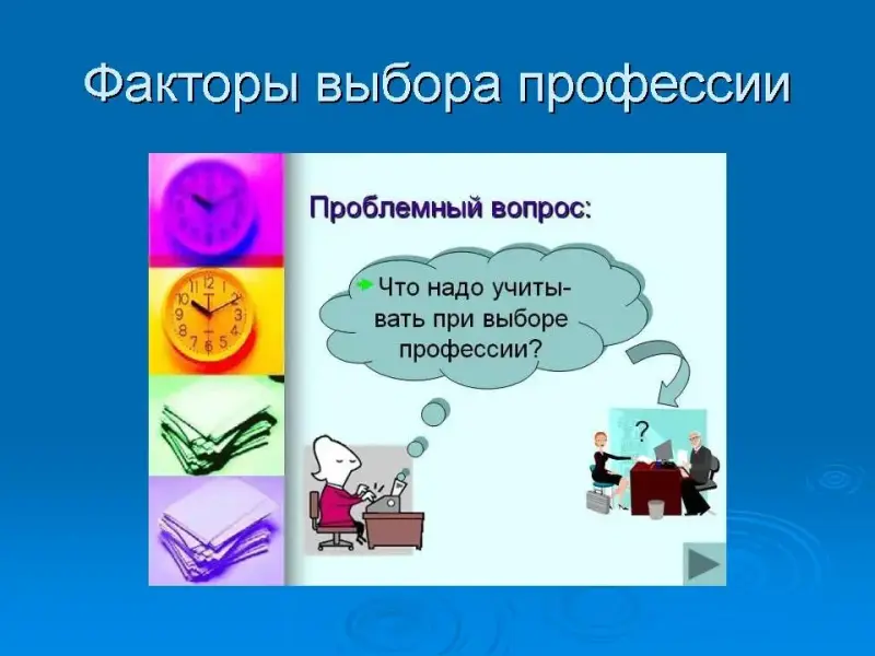 - Событийные факторы (расположение какого-либо предприятия рядом с домом, встреча с интересным человеком - представителем той или иной профессии, событие в жизни, имеющее отношение к той или иной профессии: например, один врач рассказывал, что решил стать врачом, потому что несколько лет ухаживал за больной бабушкой).