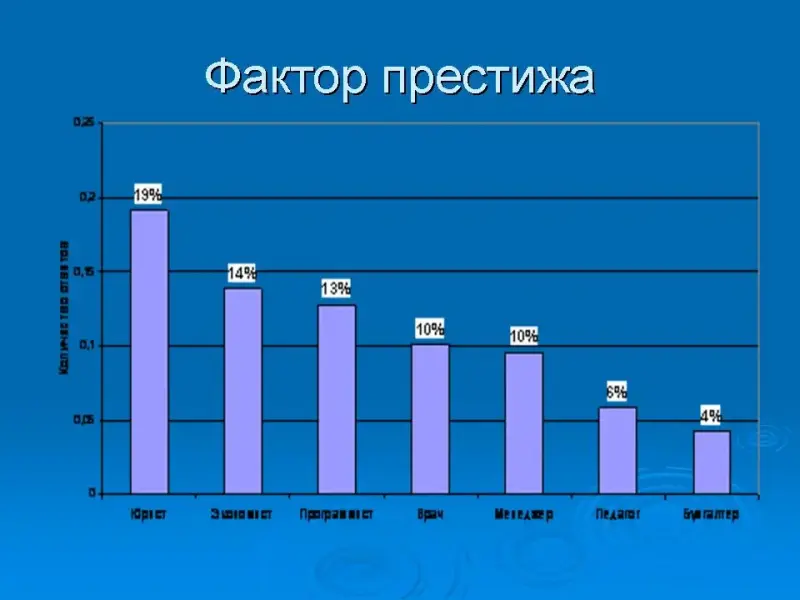 - Факторы престижа. В разные исторические периоды обществом выделяются те или иные профессии, которые становятся престижными. Например, профессия экономиста не была столь престижной в 70-е годы двадцатого века, как в девяностые годы. И, наоборот, профессия учителя в 70-е годы была более престижна, чем в 90-е годы.
