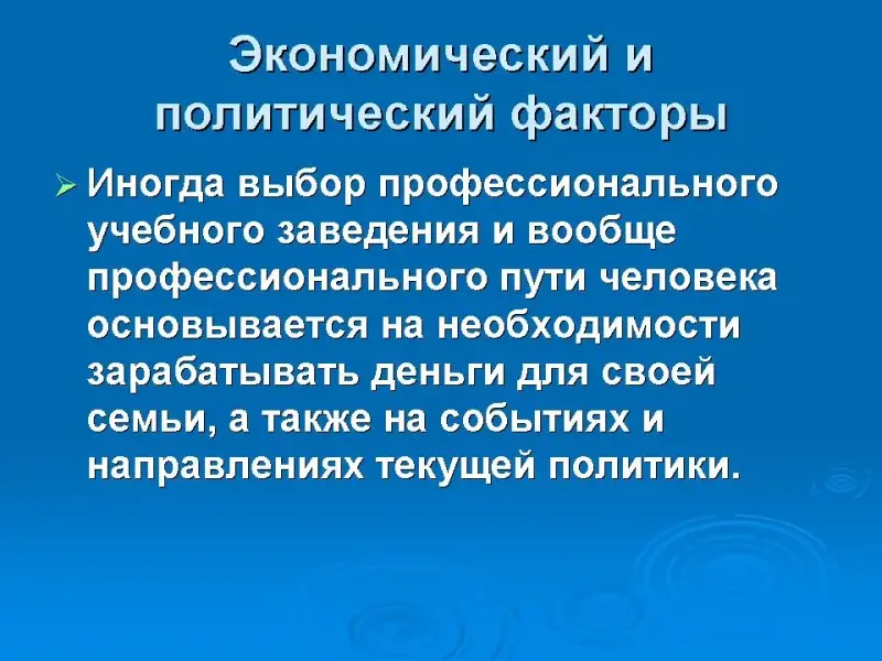 - Экономический и политический факторы. Иногда выбор профессионального учебного заведения и вообще профессионального пути человека основывается на необходимости зарабатывать деньги для своей семьи, а также на событиях и направлениях текущей политики. В переходный для нашей страны период очень многие люди сменили свое поприще именно под воздействием указанных факторов.
