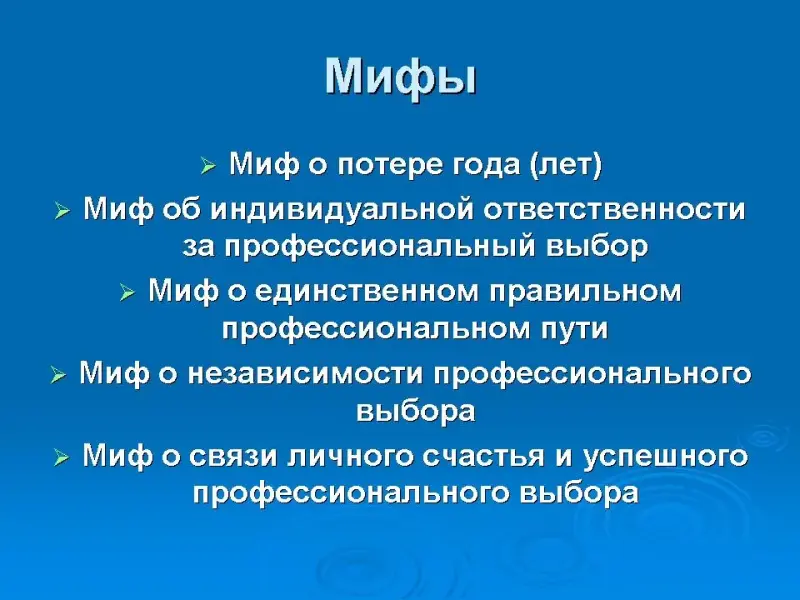 Особым фактором при выборе профессии являются так называемые мифы профессионального самоопределения. Эти самые мифы могут внести дополнительное напряжение в ситуацию профессионального выбора, а также - дезориентировать молодого человека.