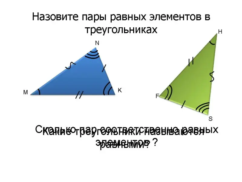 - (слайд 2) Назовите пары равных элементов в треугольниках. Сколько пар равных элементов?