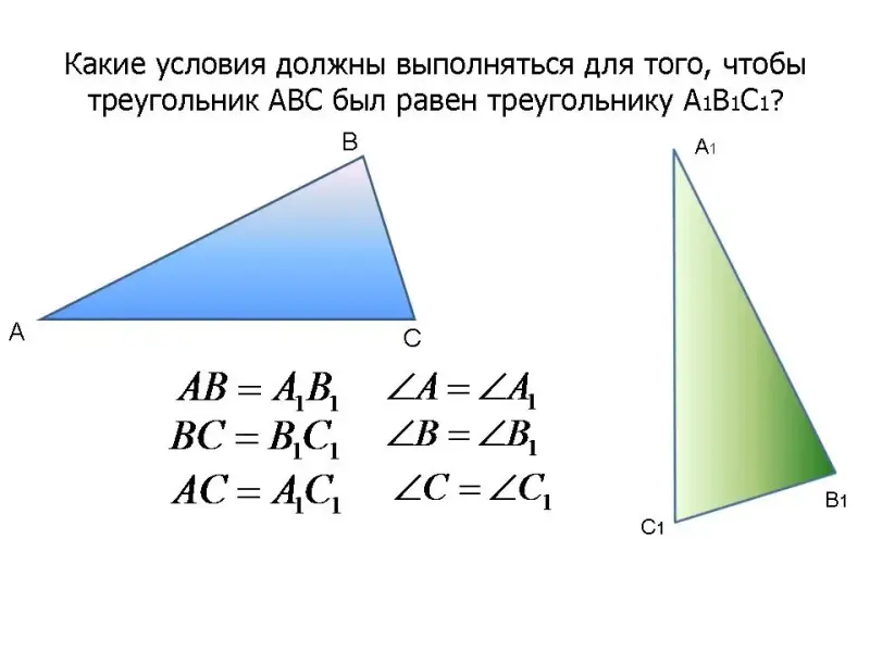 - Какие условия должны выполняться для того, чтобы треугольник АВС был равен треугольнику А1В1С1? (слайд 3)