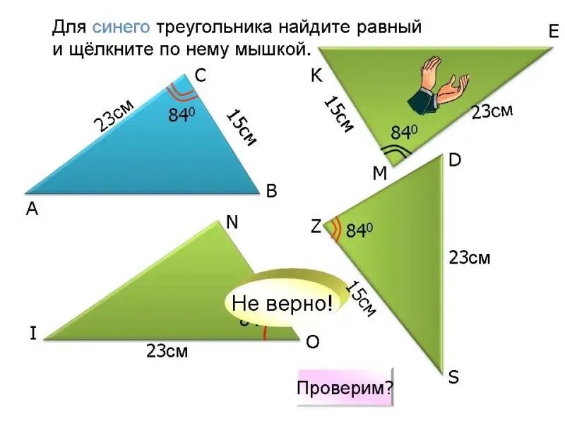 - Найдите на слайде треугольник равный синему треугольнику. (слайд 9)