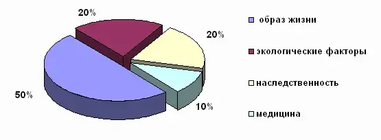 (слайд 2) Здоровье зависит от множества факторов. Ныне преобладает мнение, что здоровье человека на 50% определяется образом жизни, на 20% -экологическими, на 20% - биологическими (наследственными) факторами и на 10% - медициной. Следовательно, если человек ведет здоровый образ жизни, то все это предопределяет на 50% высокий уровень его здоровья. И, наоборот, человек, ведущий нездоровый образ жизни, подрывает свое здоровье, обрекает себя на страдания и мучения, преждевременную старость и безрадостную жизнь.