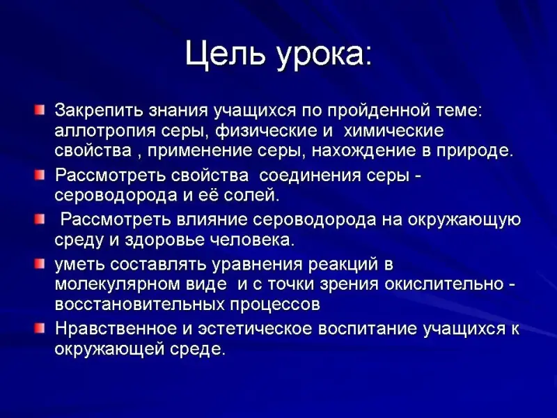 - Рассмотреть свойства соединения серы-сероводорода и её солей. - Рассмотреть влияние сероводорода на окружающую среду и здоровье человека.