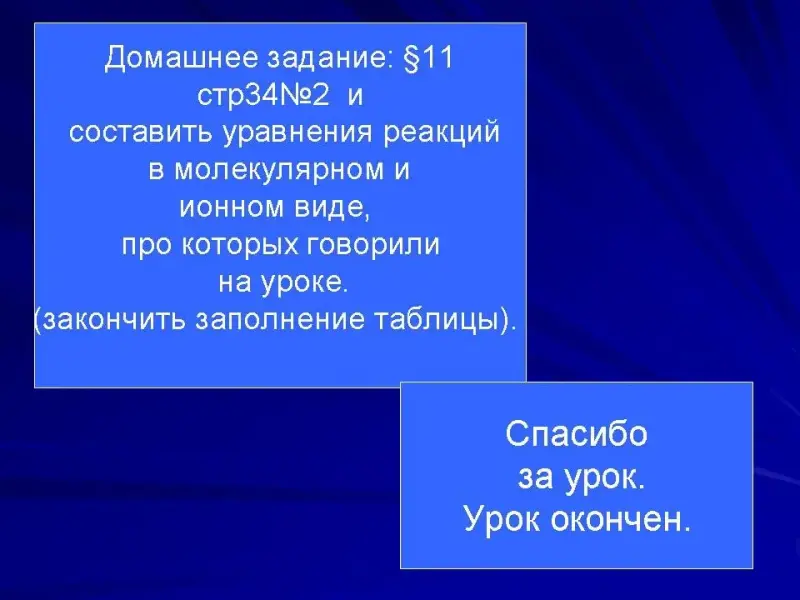 §11 стр34 №2 и составить уравнения реакций в молекулярном и ионном виде, про которых говорили на уроке. (Закончить заполнение таблицы).