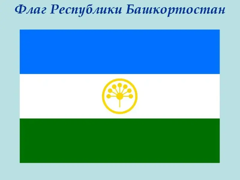 - Флаг белый, синий, зеленый. Белый цвет флага обозначает чистоту воды, синий цвет обозначает чистоту воздуха, зеленый - чистоту Земли. Семь лепестков курая обозначают 7 башкирских племен, которые выступили за вступление Башкортостана в состав России.