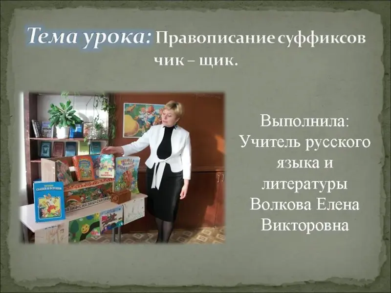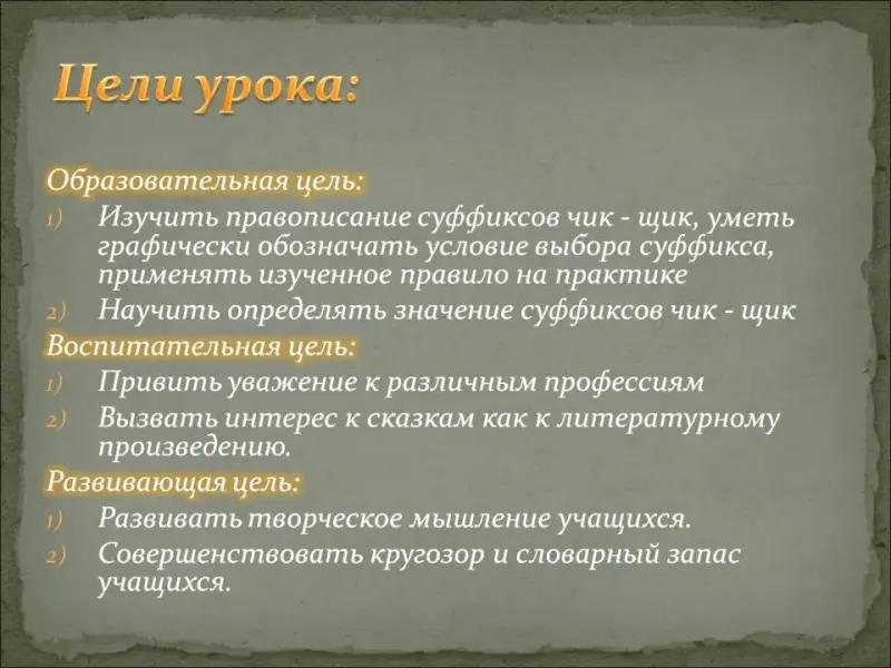 1) Изучить правило написания суффиксов чик-щик, уметь графически обозначать условия выбора суффикса, применять изученное правило на практике;