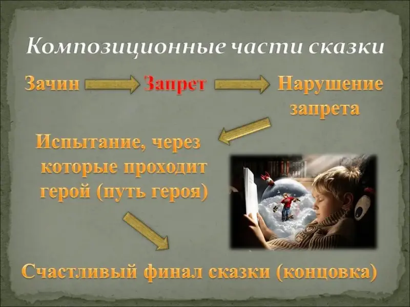 Ребята, любите ли вы читать сказки? Назовите свои любимые сказки? На какие группы можно разделить сказки? (волшебные, бытовые, сказки о животных). А как вы думаете, какой будет наша сказка и почему? Какие композиционные части можно выделить в волшебной народной сказке? (Зачин / запрет / нарушение запрета / испытания, через которые проходит герой / счастливый финал сказки / концовка).