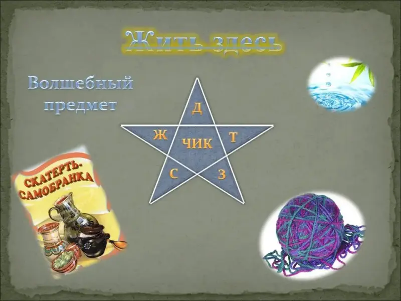 Вспомните, пожалуйста, какие волшебные предметы помогают героям в народных сказках. (Живая вода, скатерть - самобранка, клубочек и т.д.). Вам на уроке тоже будет помогать волшебный предмет. Возьмите волшебную звёздочку и в середине напишите суффикс чик, а на концах звёздочки - буквы Д - Т, З - С и Ж, которые для нас сегодня будут волшебными. Если в начале урока вы будете затрудняться, то сможете обращаться за помощью к волшебному предмету - подсказке.