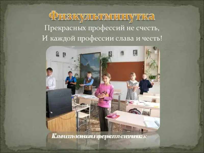 Орфографическая минутка "В царстве профессий": переплётчик, лётчик, строитель, шахтёр, ткач, врач, шофёр, комбайнёр, профессия, самолёт, убирает, не сосчитать, торговля, трудится, строит. (Слова из физкультминутки).
