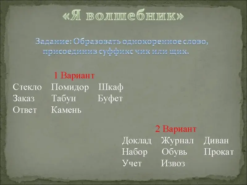 Задание "Я волшебник". В сказках много волшебства. А кто из вас хочет быть волшебником? Сейчас у вас появилась возможность стать волшебником. Я называю слово, а вы от этого слова образуйте однокоренное слово, присоединив суффикс чик или щик. 1 ВАРИАНТ: стекло - стекольщик, заказ - заказчик, ответ - ответчик, табун - табунщик, груз - грузчик, камень - каменщик. 2 ВАРИАНТ: доклад - докладчик, набор - наборщик, учёт - учётчик, обувь - обувщик, кран - крановщик, извоз - извозчик.