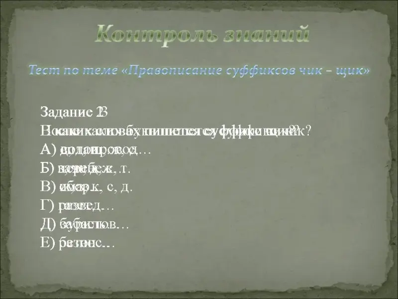 1 задание. После каких букв пишется суффикс ЧИК? А) д, т, ш, ж, с Б) з, ж, д, с, т В) ж, з, к, с, д.