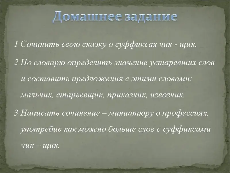 Домашнее задание. 1) Сочинить свою сказку - правило о правописании суффиксов чик - щик; 2)По словарю определить лексическое значение устаревших слов и составить предложения с этими словами: мальчик, точильщик, старьёвщик, фонарщик, приказчик, извозчик. 3)Написать сочинение-миниатюру о профессиях, употребив как можно больше слов с суффиксами чик, щик.