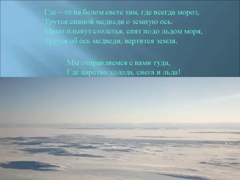 - К бескрайним просторам Северного Ледовитого океана, к его островам наш путь. Членами нашей экспедиции являются географы, ботаники и зоологи.