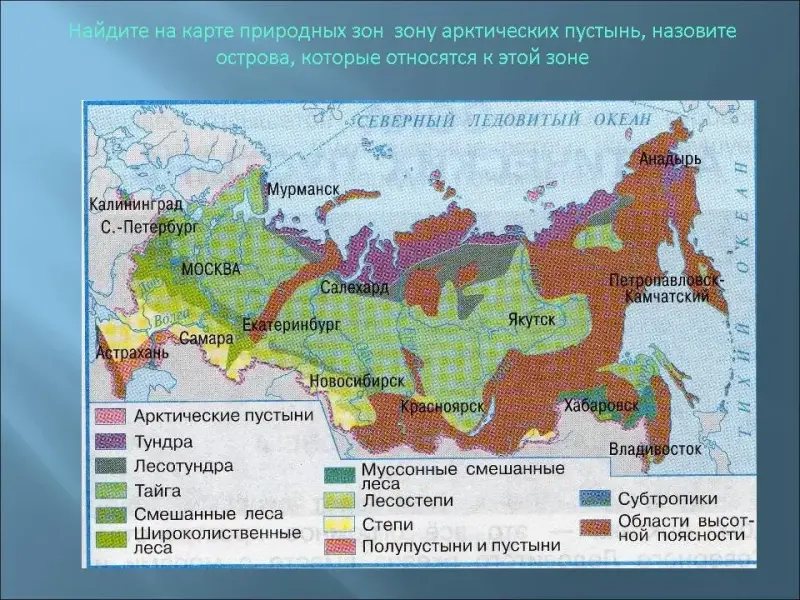 - Найдите на карте природных зон зону арктических пустынь, назовите острова, которые относятся к этой зоне (Острова: Земля Франца Иосифа, Северная Земля, Новосибирские острова и остров Врангеля). (Рисунок 3)
