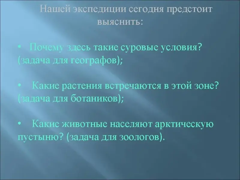 - Нашей экспедиции сегодня предстоит выяснить: Почему здесь такие суровые условия? (задача для географов); Какие растения встречаются в этой зоне? (задача для ботаников); Какие животные населяют арктическую пустыню? (задача для зоологов).