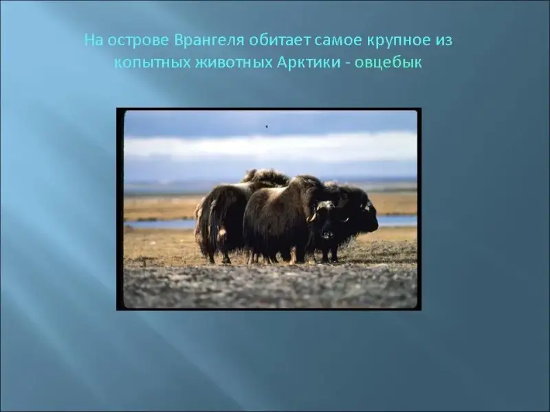 l-й ученик: Этот заповедник расположен на острове Врангеля, он был организован в 1976 году. На остров прилетает большое количество птиц на гнездовья. Через весь остров с запада на восток идут параллельно три цепи гор, разделенные долинами. Весной на юном побережье можно встретить редкую птицу - розовую чайку. Прирожденные кочевники полярных льдов выводят здесь свое потомство. На острове обитает самое крупное из копытных животных Арктики - овцебык, (Рисунок 6) завезенный в заповедник из Америки. Остров Врангеля - единственное место, где гнездятся белые гуси.