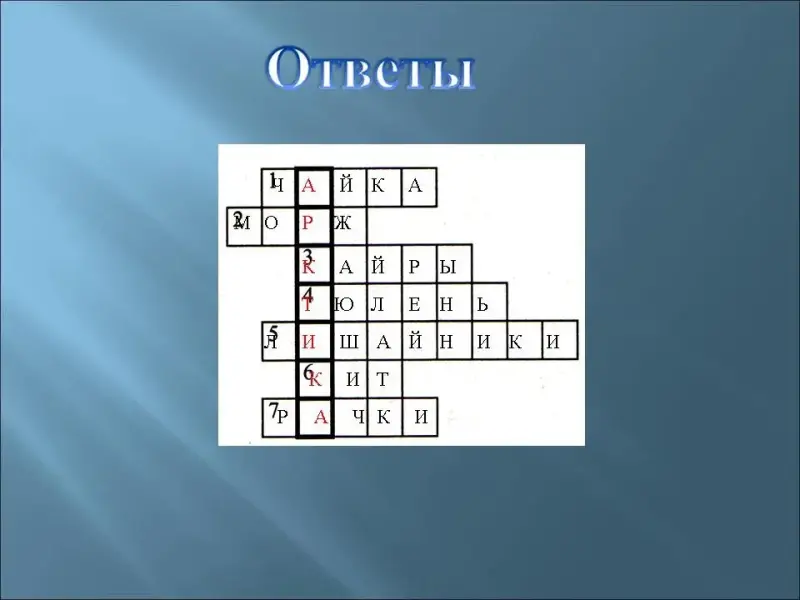 (Ответы: 1. Чайка. 2. Морж. 3. Кайры. 4. Тюлень. 5. Лишайники. 4 Кит. 7. Рачки. Ключевое слово: АРКТИКА.)(Сл 27)